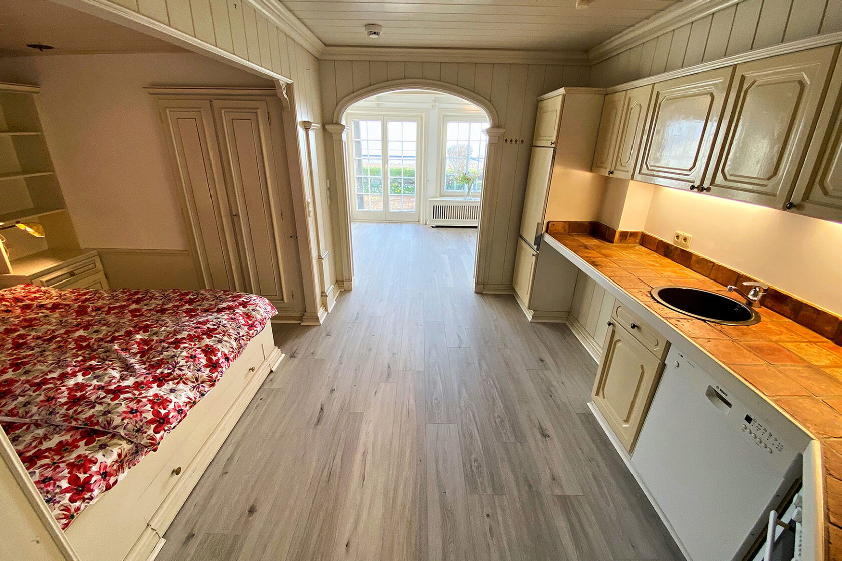 Im Erdgeschoss befinden sich sehr aufwendig getischlerte Einbauten und ein mit antiken Delfter Fliesen dekorierter Kamin. Die Einrichtung ist aber schon etwas in die Jahre gekommen.